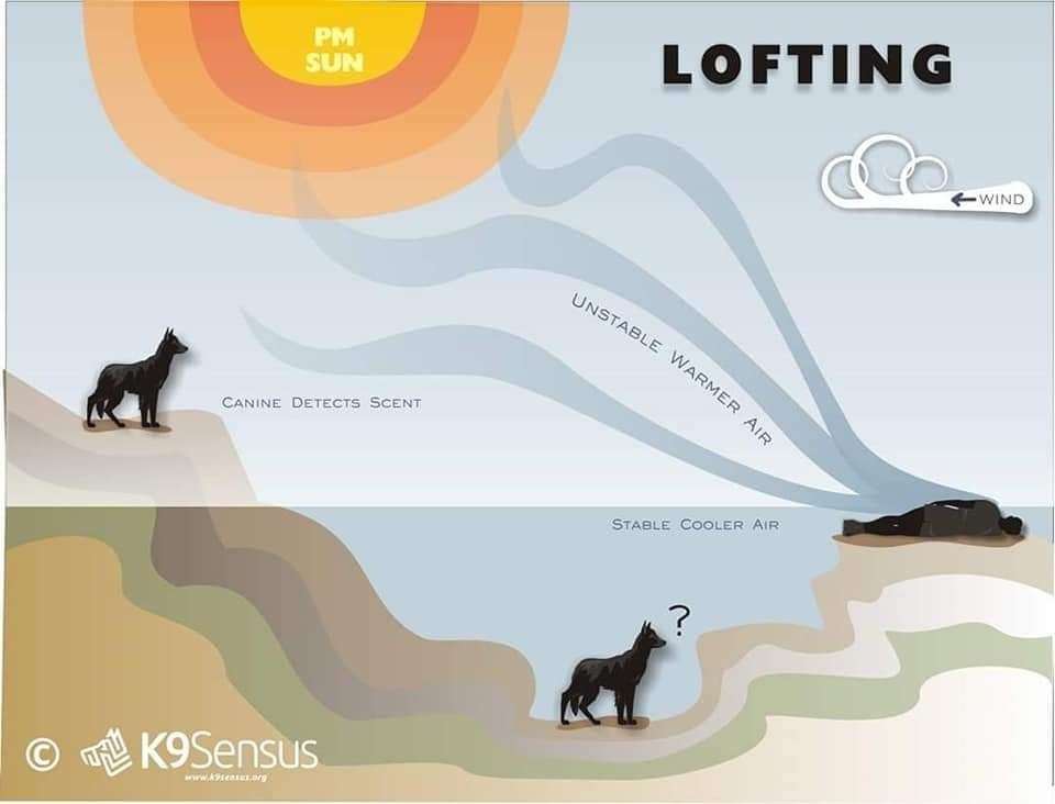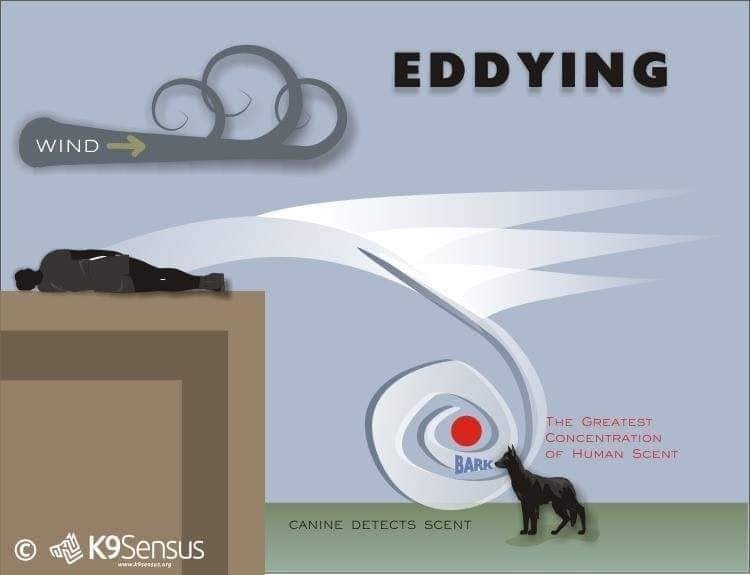 Такие особенности местности, как линии деревьев, скальные стены и вспаханные поля, могут вызывать завихрения запаха, который кружится вокруг деревьев, за стенами и над стенами и просачивается на расчищенные участки. В сухие жаркие дни без заметного ветерка запах может подниматься прямо вверх, и собака не найдет помощника или пропавшего человека, если не наткнется на него.