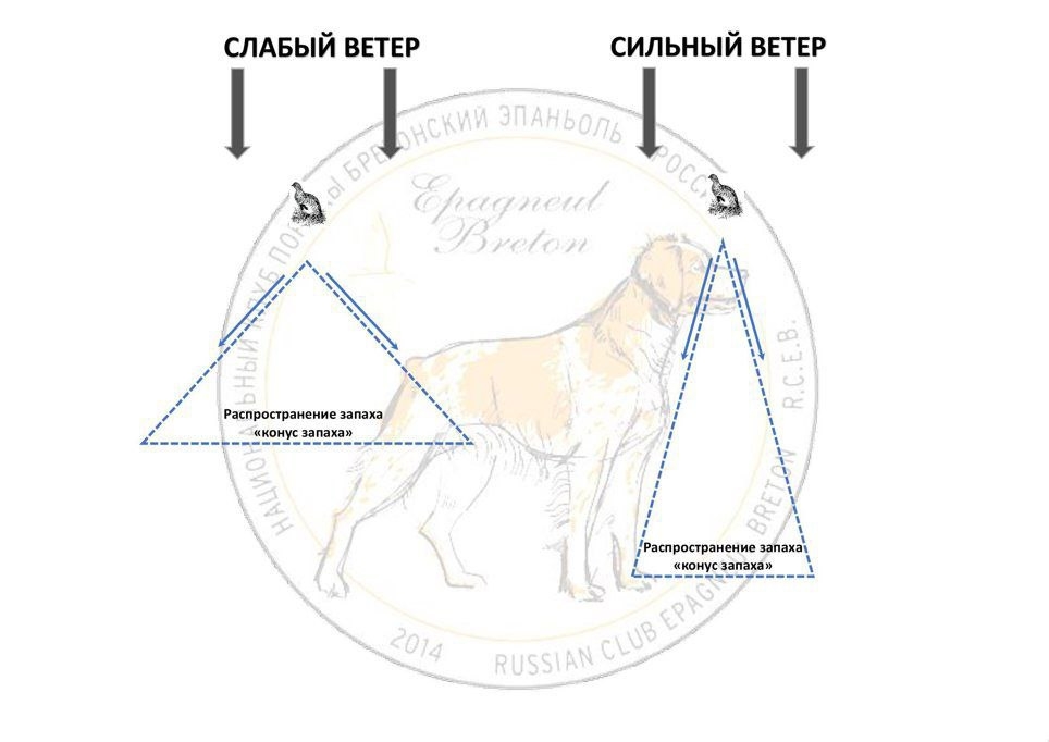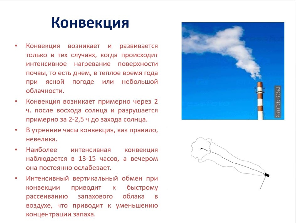 Конвекция (тепловые потоки): запах уходит вверх. Оптимальная тактика — двигаться перпендикулярно потоку, чтобы собака «перерезала» шлейф.