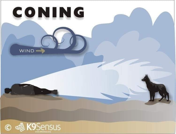 Когда мы говорим о запахе, то имеется в виду конус запаха, выделяемый человеческим телом. Теория конуса запаха объясняет, что тело человека является источником запаха, или вершиной конуса. По мере удаления от источника запаха он расширяется, образуя основание конуса. По мере удаления от источника, запах становится слабее, или ветер разносит его в неправильной форме. Собака найдет этот запах и будет работать в запаховом облаке или коридоре, проверяя воздух, пока не придет к вершине конуса - источнику.