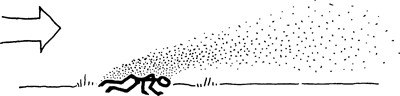 Диффузия (штиль, слабый ветер): молекулы расходятся равномерно, без выраженного направления. Собака возьмёт запах только вблизи источника.