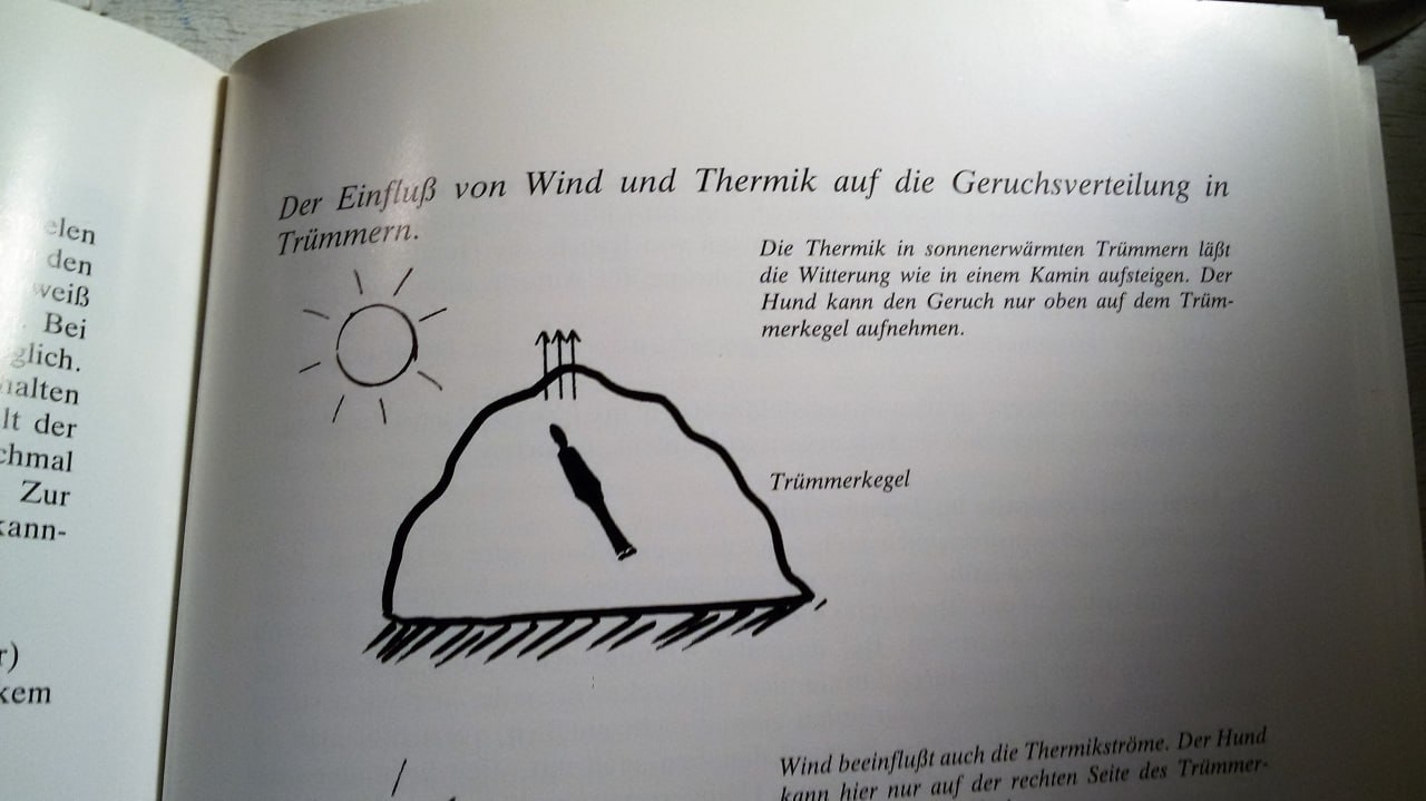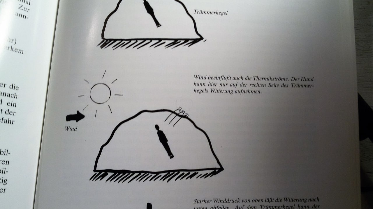 Утром, когда земля прогреется, запах будет подниматься, потому что запах от теплых предметов или мест поднимается в холодном воздухе. В таких условиях лучше всего работать с собакой над низкими участками, чтобы она могла обнаружить поднимающийся запах.